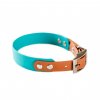 Dvoubarevný obojek pro psy z biothanu ve dvojí šířce: 25 mm v široké části a 19 mm u přezky a zapínání.