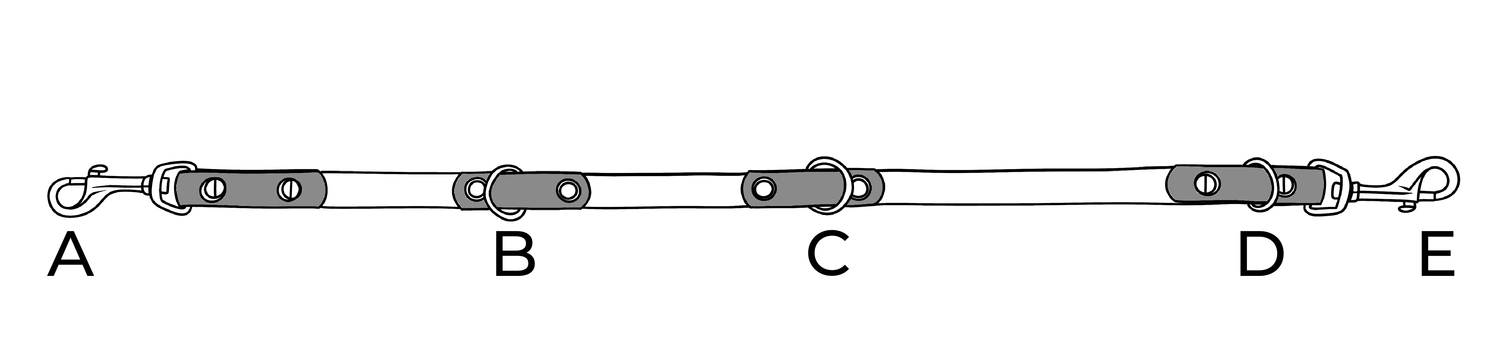 Očko D (pevné): Nachází se přímo u karabiny E. Zapnutím karabiny A do očka D vodítko přeložíte přesně na polovinu. Je to nejkratší možná verze vodítka pro maximální kontrolu psa (např. v MHD nebo v davu).
